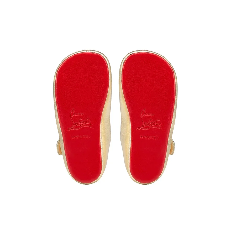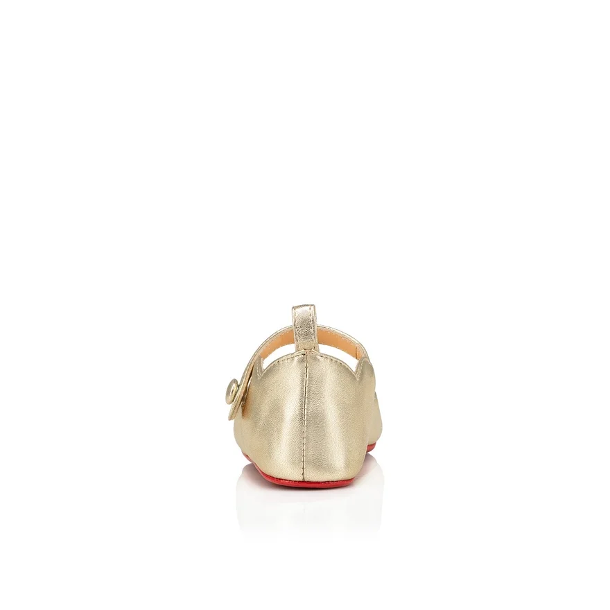 The Charming Baby Love Chick Ballerina Pump Has a Timeless Style and is Crafted from a Platine Gold Laminated Nappa Leather. Inspired by the Iconic Hot Chick Shoe, This Maison Christian Louboutin Design Has a Heart-Shaped Scallop Cut-Out on the Sides and Visible Topstitching. An Elasticated Strap on the Side and Heel Tab Heel Make This Shoe Easy to Slip on and Off.