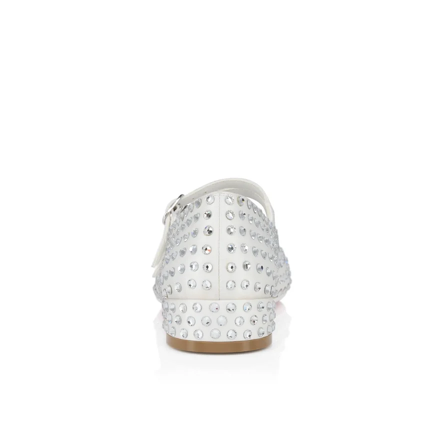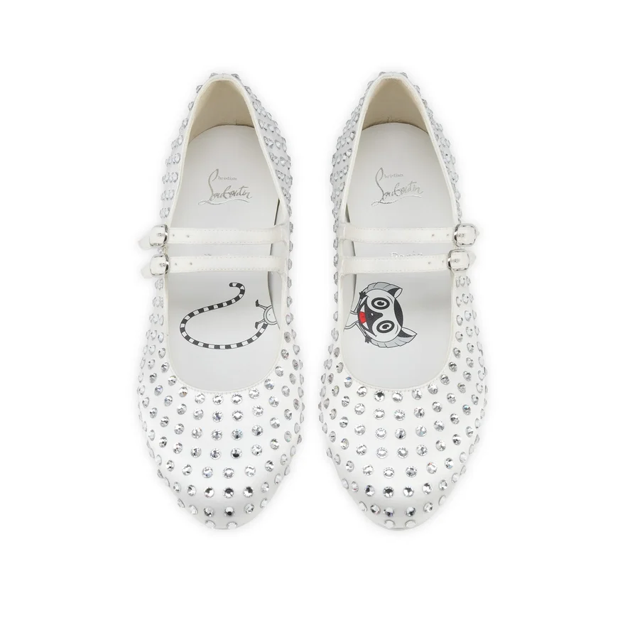 The Jane Fille Strass Boum Ballet Flat Echoes the Lines of Maison Christian Louboutin’s Iconic Jane Pump with a Rounded Toe and Two Slender Straps Across the Upper. This Ballerina Shoe is Crafted in All over Ivory Crepe Satin with Tonal Lining, and Adorned with Signature Over-Sized Strass. For Special Occasions or Extra Everyday Sparkle.