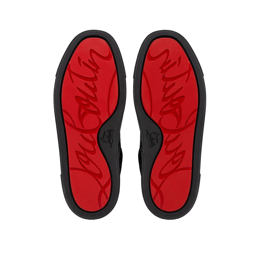 The Funnyto Low-Top Sneaker Has Sleek Lines. This Sporty Maison Christian Louboutin Style is Crafted in Laminated Suede Calf Leather and Comete Black Veau Velours, Evoking a Starry Sky.