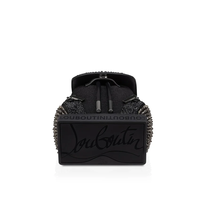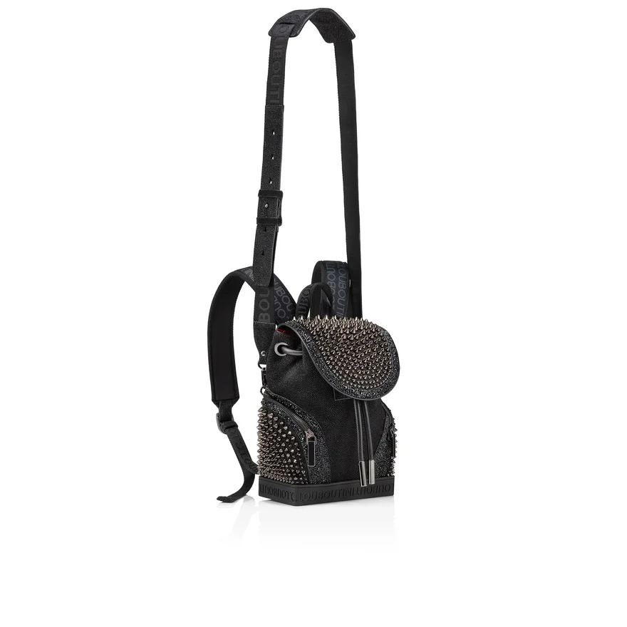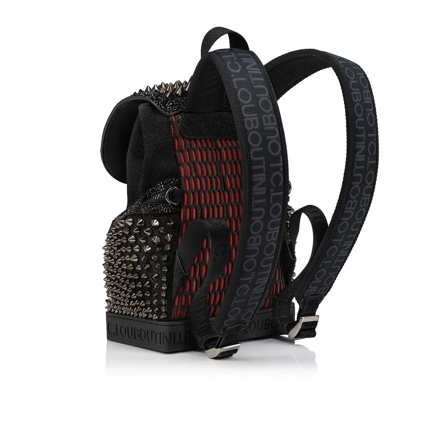 The Urban Explorafunk Backpack in Size Small Features Modern Lines. This Model in All-Over Black Combines Veau Velours and Sparkly Suede and is Adorned with a Maison Christian Louboutin Signature and Iconic Black Spikes.