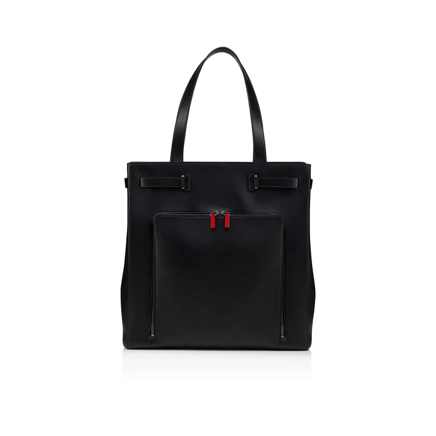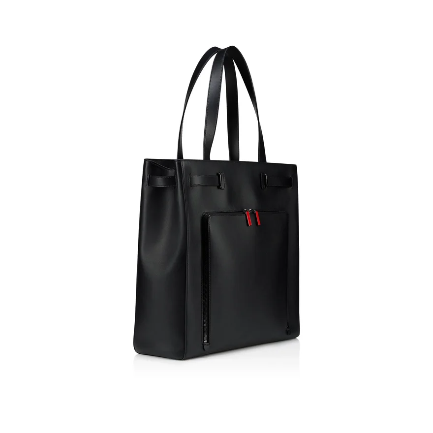 The Djanis Modern and Functionnal Tote Has Sleek Lines That Embody the Maison Christian Louboutin Style. A Bag That Showcases Urban Elegance, Crafted from a Silky-Smooth Black Buttery Calf Leather. This Model Features a Lasered Louboutin Signature on the Bottom Base of the Bag.