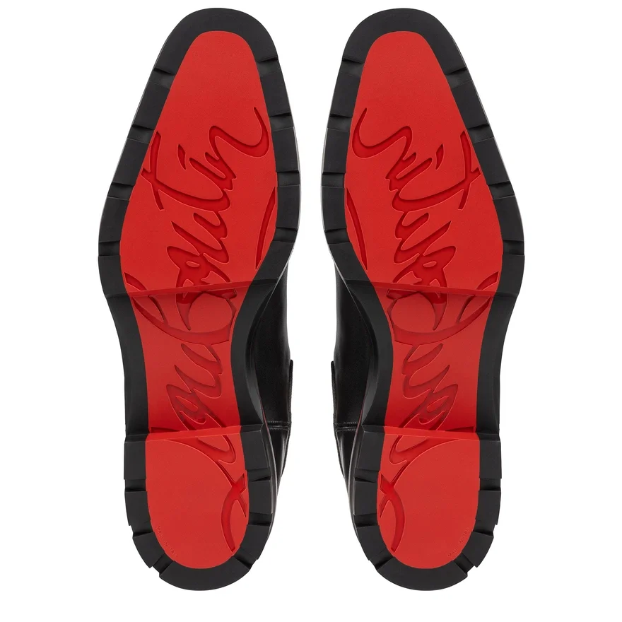 Inspired by the Mountains, the Alpinosol Ankle Boot is Timeless. This Maison Christian Louboutin Model in Black Calf Leather Has an Elasticated Side Band. It Sits on a Lug Sole with a Loubi Red Stripe Around It and Features a Heel Tab. The Curved Silhouette of This High-Top Model is Enhanced with Tonal Grosgrain Ribbon Trim.