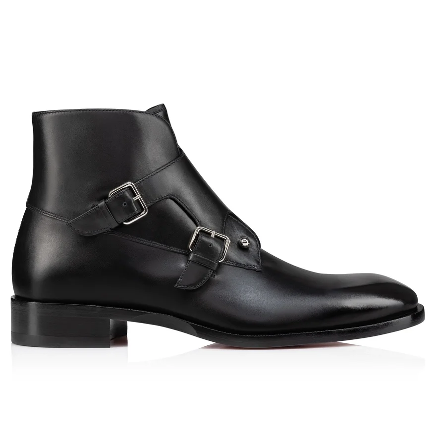 The Chambelimonk Boot Has a Bold Attitude and Rock Appeal That Works with Both Elegant, Tapered Trousers and Jeans. This Striking Maison Christian Louboutin Model is Crafted in Smooth Black Calf Leather. The Vamp is Pierced with a Signature Metal Collar Pin, and Two Metal Buckles Fasten on the Side. A Thick Sole and Large Notched Welt Offer a Rugged Finish.