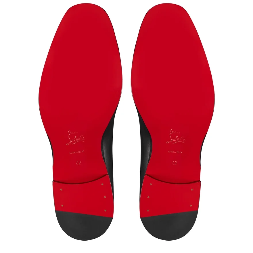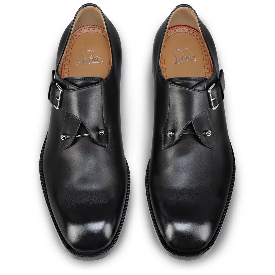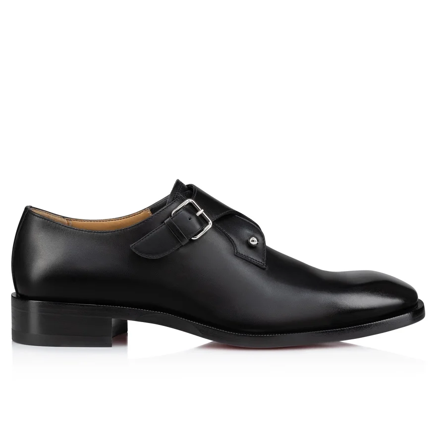 The Timeless Chambelimonk Loafer Stands out for Its Refined Design. Crafted from Black Calf Leather, This Maison Christian Louboutin Shoe Features a Side Strap, Adjustable with a Silver Buckle. It is Distinguished by a Cross Silver Collar Pin for a Bold Look.