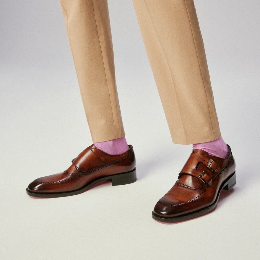 The Sartok Shoe Has a Sophisticated Style. Crafted from Patinated Havana Brown Calf Leather, This Maison Christian Louboutin Derby Has Graphic Perforations That Showcase Its Elegance Alongside Two Side Buckles. Each Perforation Has Been Carefully Coloured Using a Small Precision Brush.