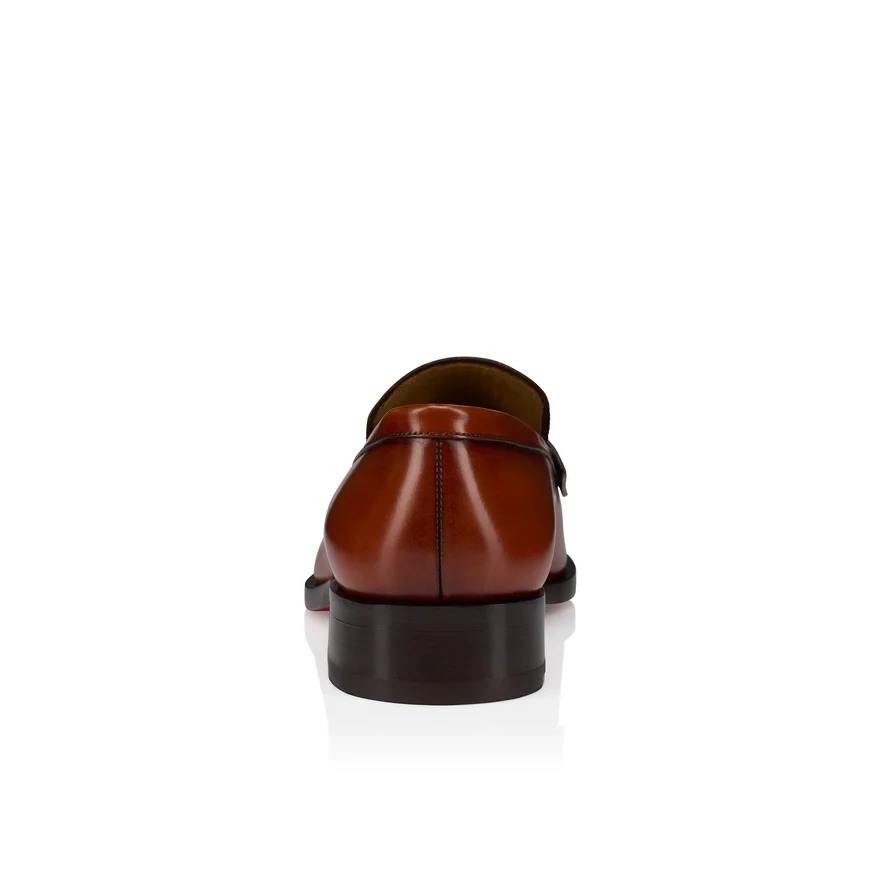 The Chambelimoc Loafer Offers a Sleek Design. This Maison Christian Louboutin Model is Crafted in Palio Brown Calf Leather with a Patinated Effect Handcrafted on the Front. It is an Elegant Shoe Featuring Side Straps Joined by an Audacious Silver Collar Pin.