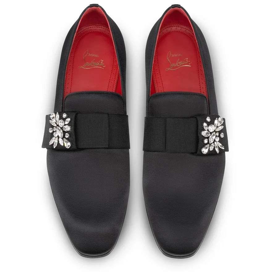 Embellished with a Sprinkling of Sparkling Gemstones, the Dandelion Red Carpet Men’s Loafer Echoes the Panache of the Film Industry. An Elegant Silhouette Finished with an Almond Toe Creates a Sophisticated Shoe That Will Enhance Any Outfit with a Sense of Timeless Elegance. Crafted from Black Crepe Satin for an Opulent Feel, the Loubi-Red Sole Reflects the Essence of Maison Christian Louboutin.