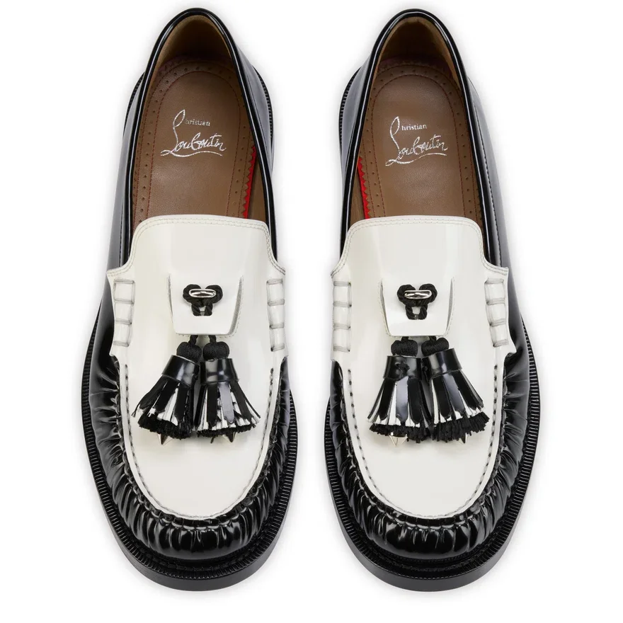 The Timeless Orlando Loafer is Partially Hand-Stitched and Adorned with Two Distinctive Leather and Textile Tassels, Each Decorated with a Spike. Crafted in Black and Bianco White Slightly Shiny Calf Leather, This Model Features the Iconic Loubi Red Sole, the Embodiment of Maison Christian Louboutin Sophistication.