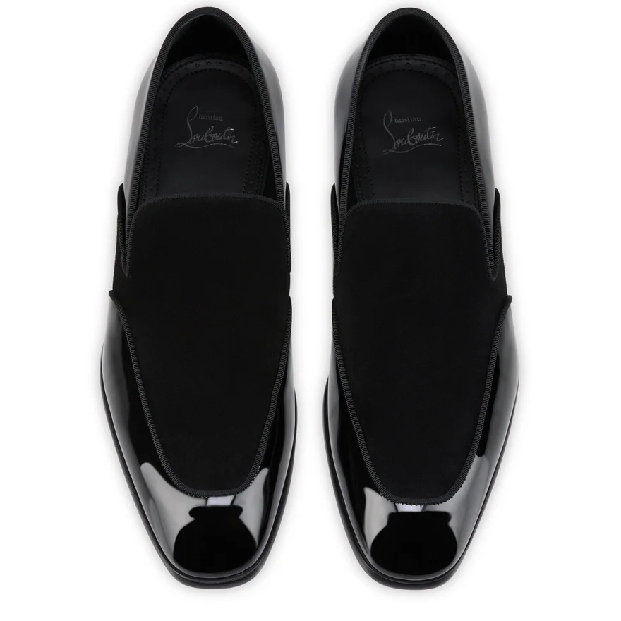 The Yaki Loafer Showcases Maison Christian Louboutin’s Creativity. Crafted from Patent Leather and Veau Velours, the Fusion of Textures Creates a Sophisticated Finish. This Model is Shaped with a Narrow Silhouette and Features the Iconic Loubi Red Sole.