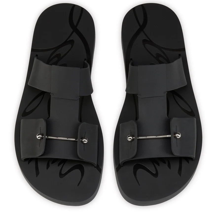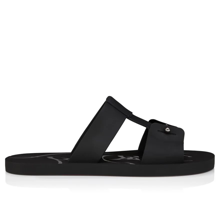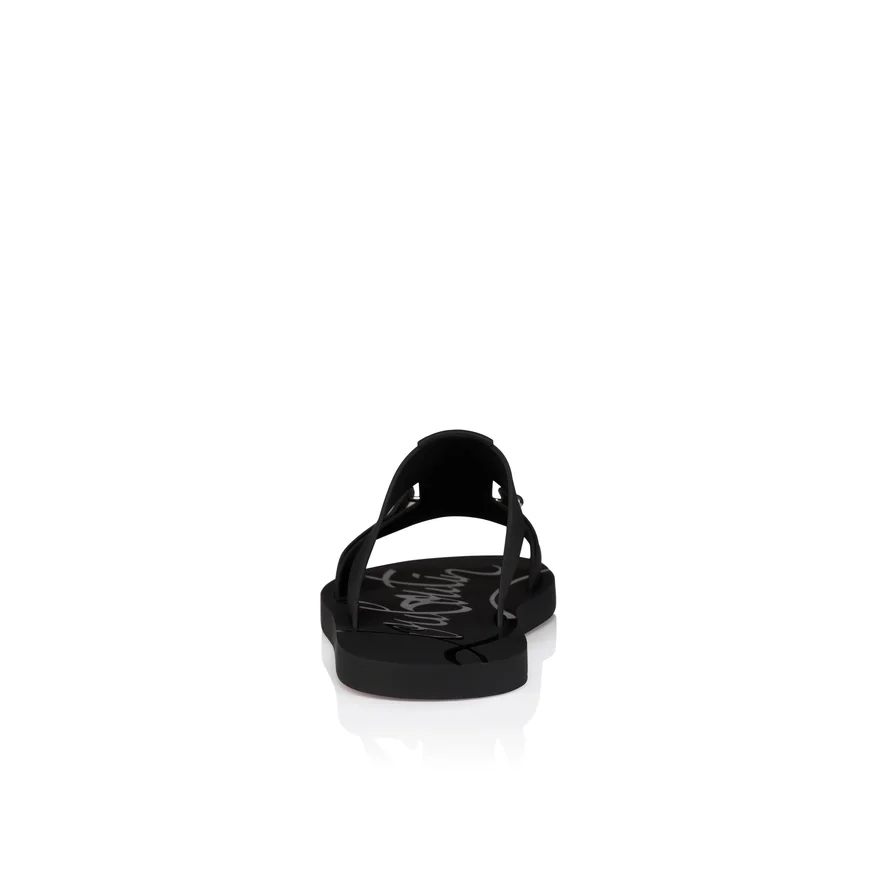 The Zakouski Summer Mule Echoes Maison Christian Louboutin’s Timeless Elegance. Crafted from Rubber in a Refined Black Mat Finish, a Signature Collar Pin Adorns the Upper While a Shiny Embossed ‘Louboutin’ Signature on the Footbed Creates a Distinctive Finish.