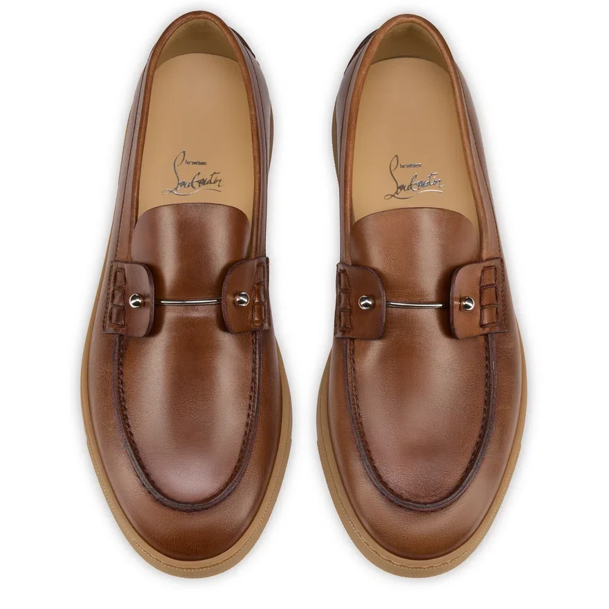 The Chambeliboat Boat Shoe Has a Sleek Silhouette. An Elegant Design with a Supple Construction Crafted from Havane Brown Patinated Calf Leather. This Shoe’s Tongue is Trimmed with a Metal Collar Pin, Showcasing Maison Christian Louboutin’s Creative Flair. A Light, Summery and Urban Model Set on a Beige Rubber Sole.