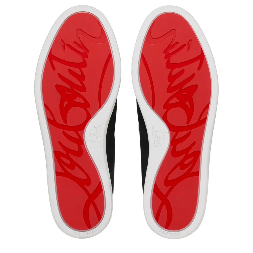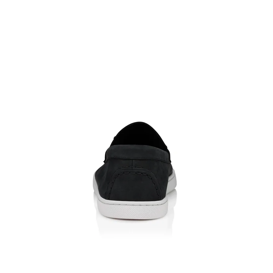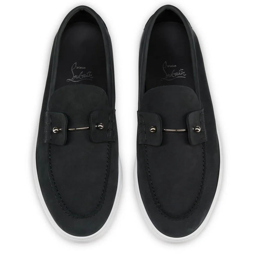 The Chambeliboat Boat Shoe Has a Sleek Silhouette. An Elegant Design with a Supple Construction Crafted from Unlined Black Nubuck Leather. This Shoe’s Tongue is Trimmed with a Metal Collar Pin, Showcasing Maison Christian Louboutin’s Creative Flair. A Light, Summery and Urban Model Set on a White Rubber Sole.