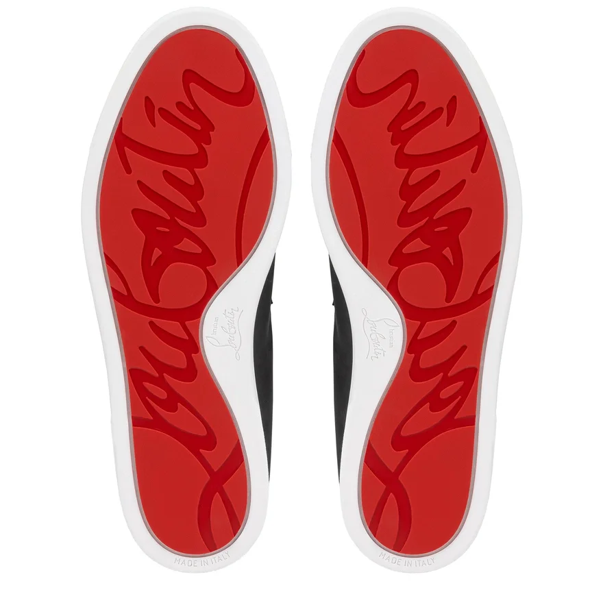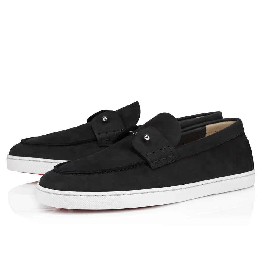 The Chambeliboat Features Sleek Lines. This Elegant Style is Crafted in Black Nubuck. It Features a Tongue Adorned with a Metal Collar Pin, Showcasing Maison Christian Louboutin’s Expertise. A Summery Model with a White Rubber Sole.