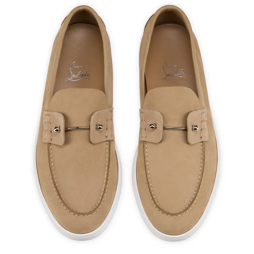 The Chambeliboat Boat Shoe Has a Sleek Silhouette. An Elegant Design with a Supple Construction Crafted from Unlined Lionne Beige Nubuck Leather. This Shoe’s Tongue is Trimmed with a Metal Collar Pin, Showcasing Maison Christian Louboutin’s Creative Flair. A Light, Summery and Urban Model Set on a White Rubber Sole.