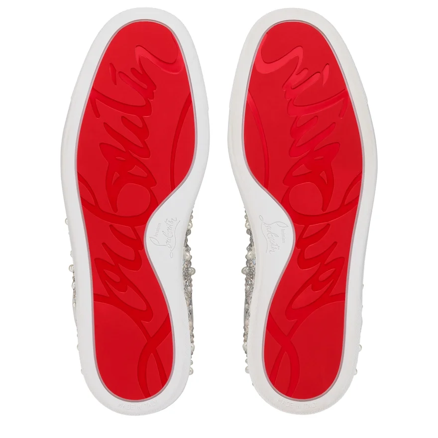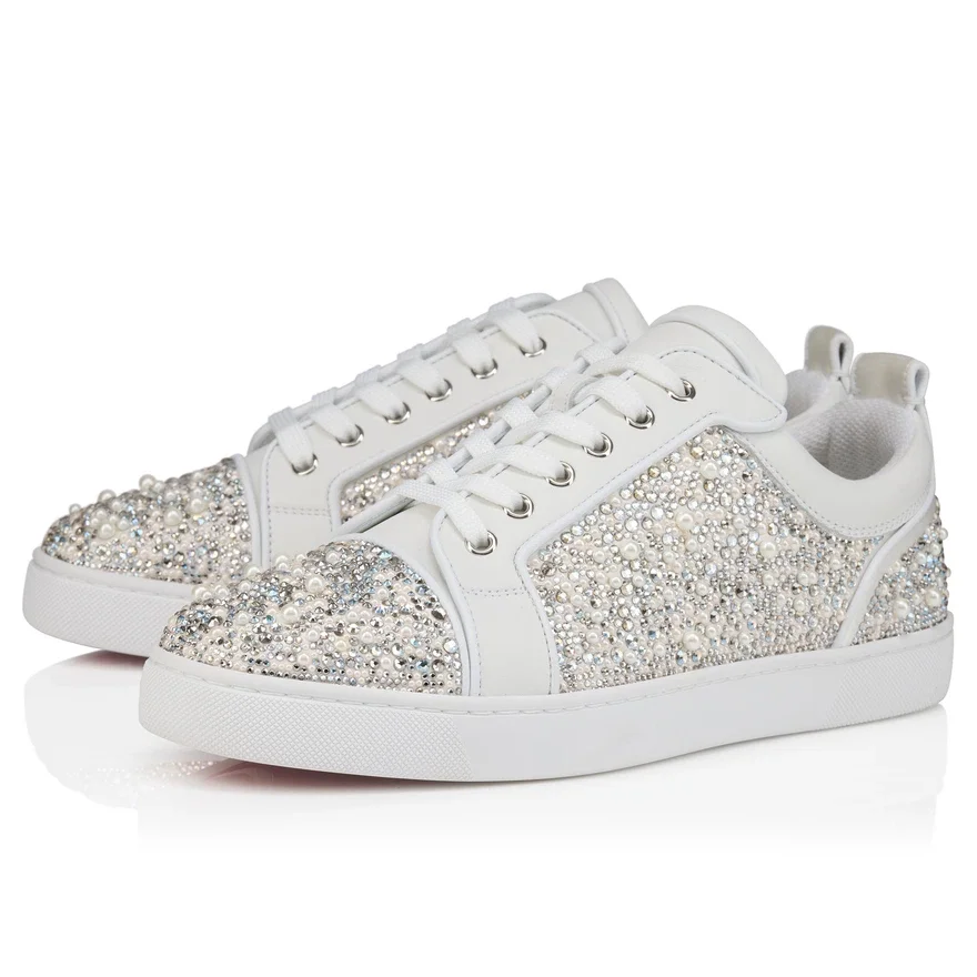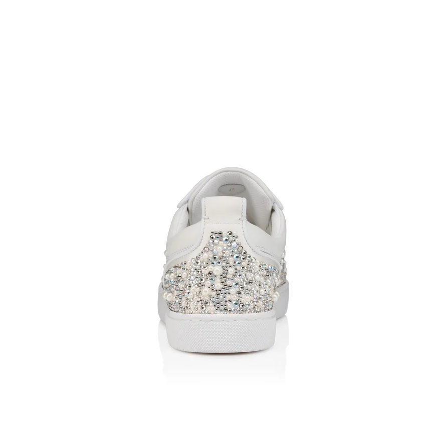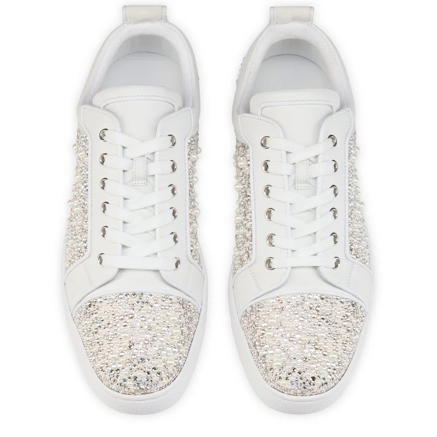 The Louperla Jr Low-Top Sneaker Combines Elegant, Sporty Lines. This Maison Christian Louboutin Sneaker is Crafted in White Calf Leather and Lamb Nappa Leather. It is Characterized by the Strass and Pearls Partly Hand-Applied on a Silk Crepe Satin Base That Adorn Its Sophisticated Silhouette. It Also Has a More Flexible Construction.