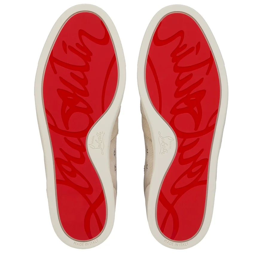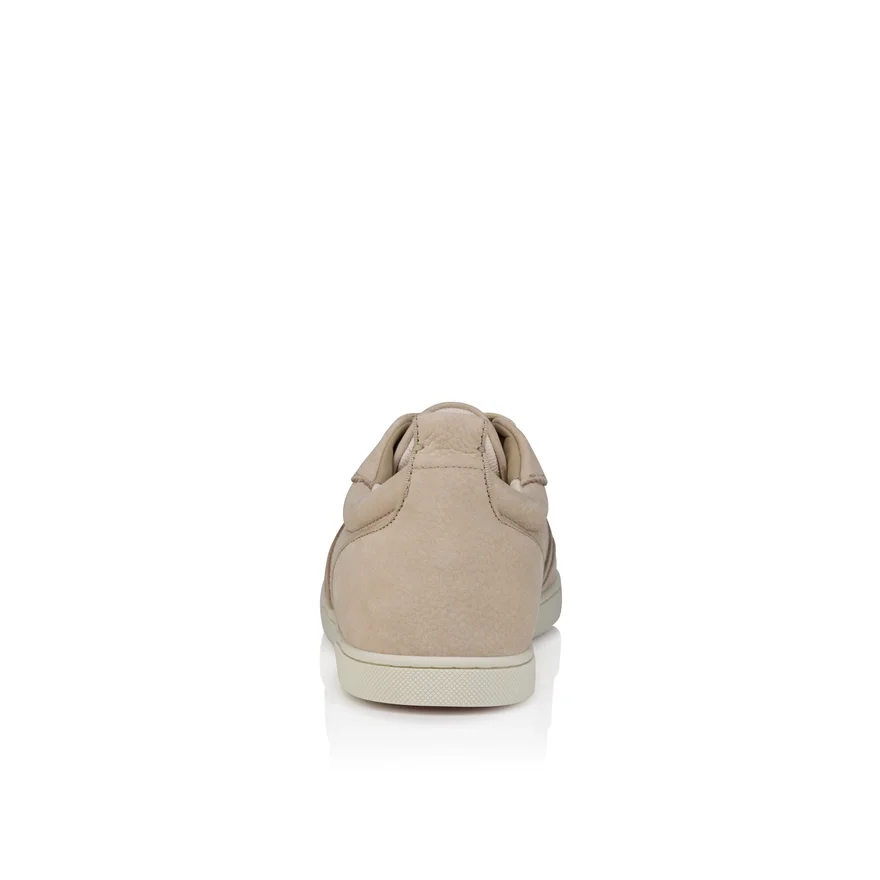 Maison Christian Louboutin’s Tutti Rui Vintage-Inspired Flat Sneaker Offers an Elegant Outline That Elevates Any Outfit. Crafted in Beige Grained Nubuck Leather, the Textured Detail on the Upper is Enhanced by the Iconic Cl Signature Logo. This Model Features a Practical Heel Tab.