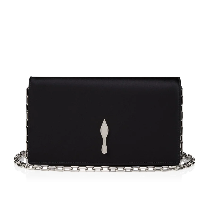 The Sophisticated Bettina Clutch Features a Silver Embellishment on the Front, Evoking the Silhouette of the Iconic Sole. This Signature Model from Maison Christian Louboutin is Entirely Crafted in Black Crepe Satin and is Ideal for Nights out. This Clutch is Part of the Hollywood Capsule.- A 44.9 Inch / 114 Cm Chain Strap Allows It to Be Carried by Hand or over the Shoulder- Magnetic Button Fastening- 1 Main Compartment- 1 Flat Inside Pocket- 3 Card Slots- Dimensions: – H 4.7 X L 8.7 X W 2 Inches- H 12 X L 22 X W 5 Cm