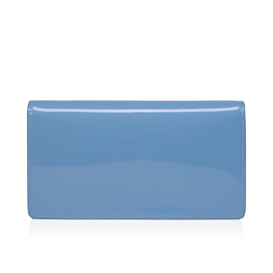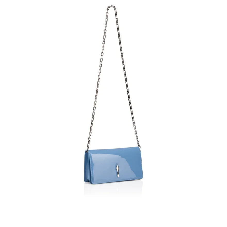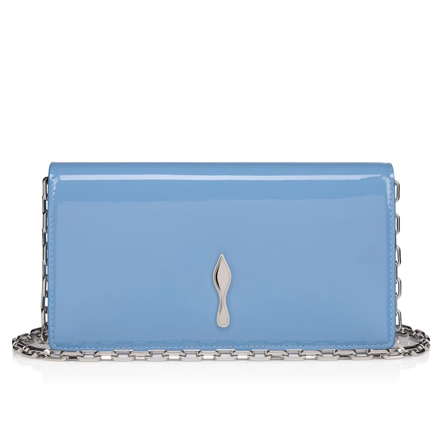 The Sophisticated Bettina Clutch Features a Silver Embellishment on the Front, Evoking the Silhouette of the Iconic Sole. This Signature Model from Maison Christian Louboutin is Entirely Crafted in Ceruleo Blue Glossy Patent Calf Leather.