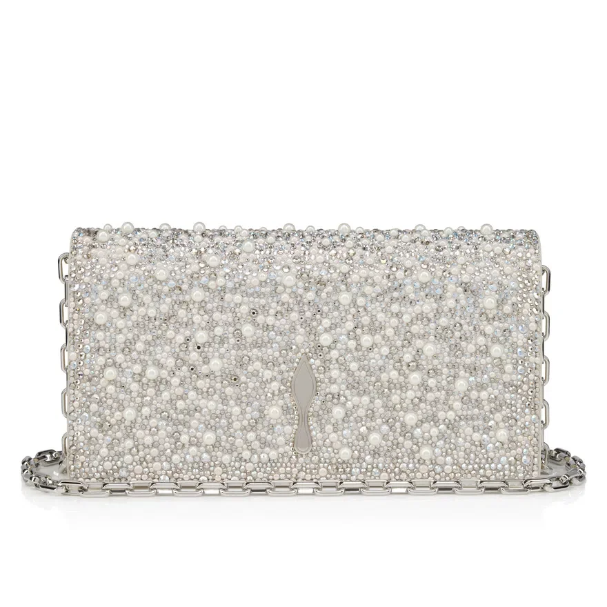 The Sophisticated Bettina Clutch Features a Silver Embellishment on the Front, Evoking the Silhouette of the Iconic Sole. This Signature Model from Maison Christian Louboutin is Crafted in Black Suede Calf Leather and Enhanced with 3,896 Strass and 1,754 Pearls for a Striking Result Ideal for Nights Out.