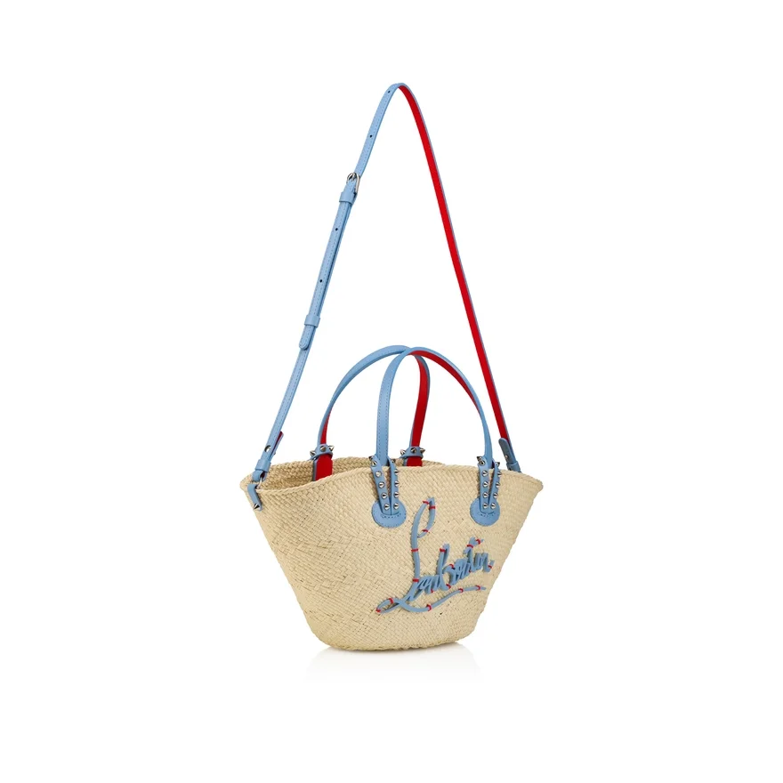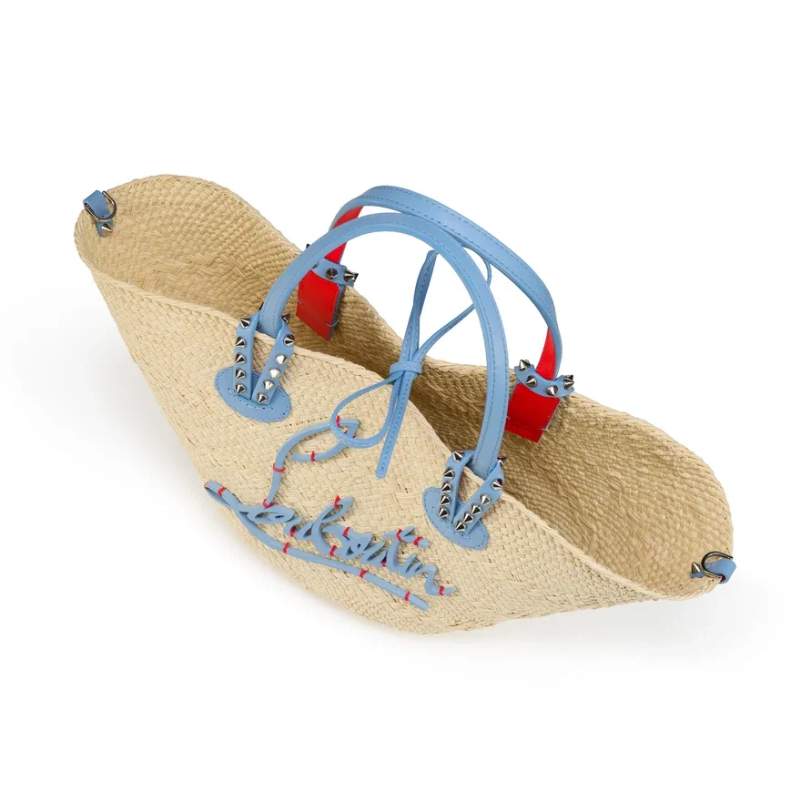 The Cabata Basket Bag in Size Mini Has a Sun-Drenched Spirit with a Modern Twist. It is Crafted from Smooth Calf Leather and Hand-Woven Raffia, Making It Strong, Durable, and Lightweight. This Model Features Some Hallmarks of the Iconic Maison Christian Louboutin’s Cabata Tote: Signature Metallic Spikes Encircling the Ceruleo Blue Handles.