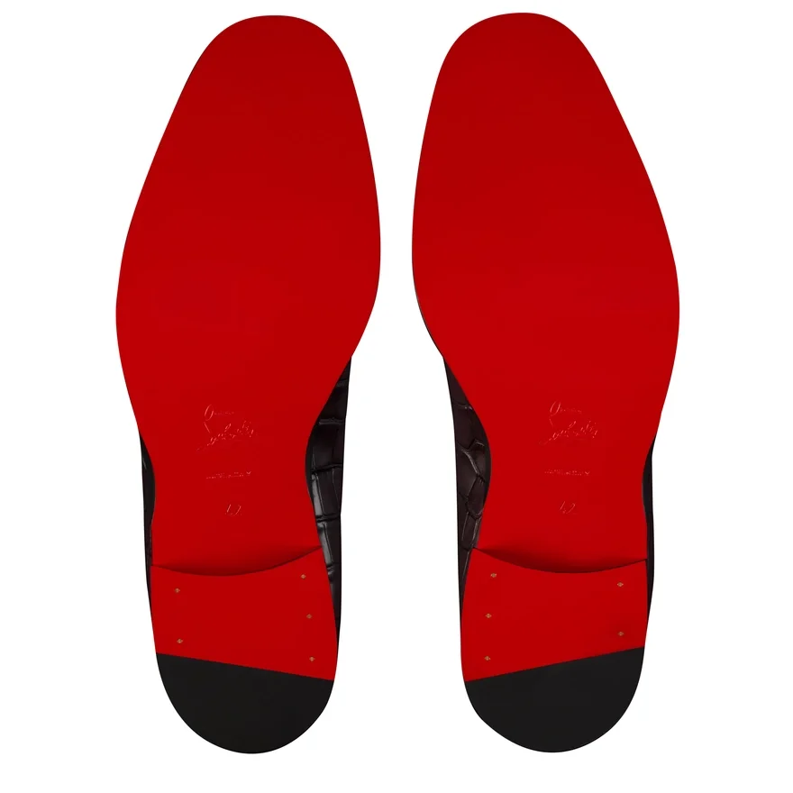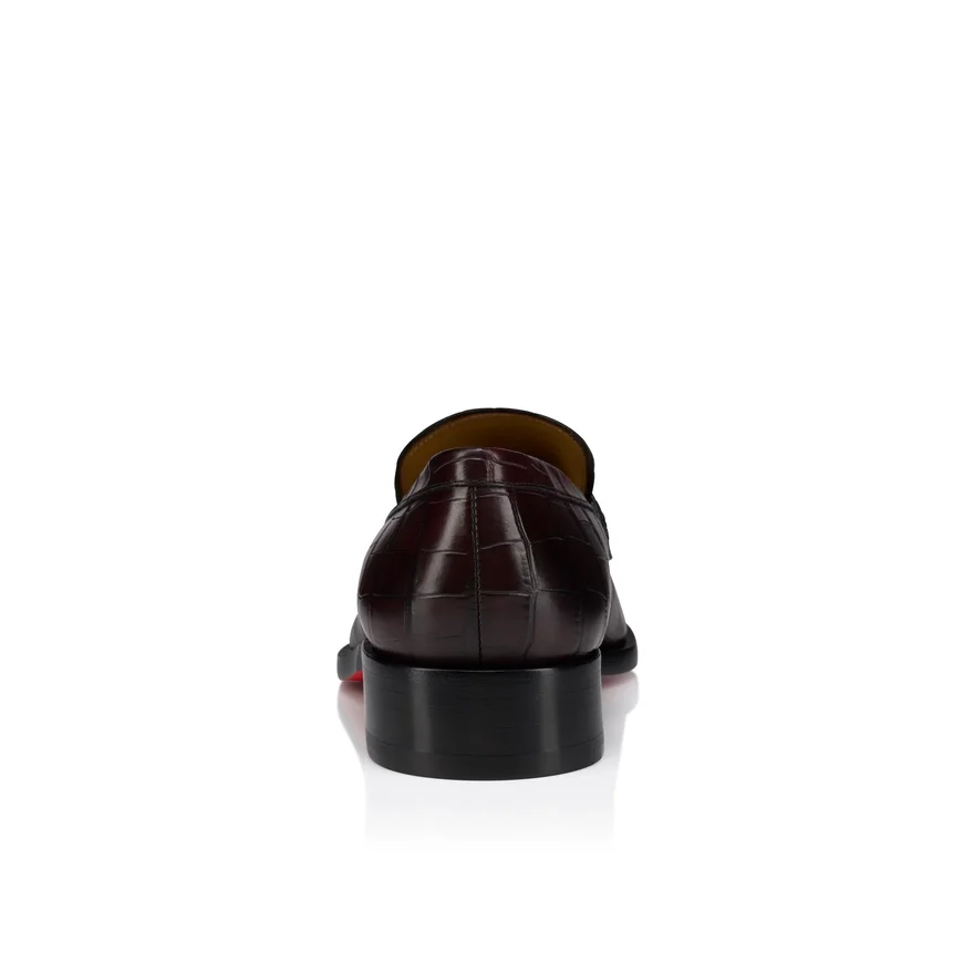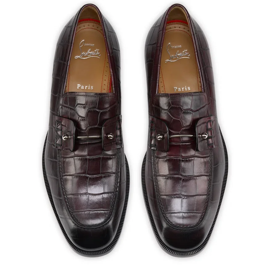 The Chambelimoc Loafer Offers a Sleek Design. This Maison Christian Louboutin Model is Crafted in Amara Burgundy Alligator-Embossed Calf Leather with a Hand-Made Patinated Effect. It is an Elegant Shoe Featuring Side Straps Joined by an Audacious Silver Collar Pin.