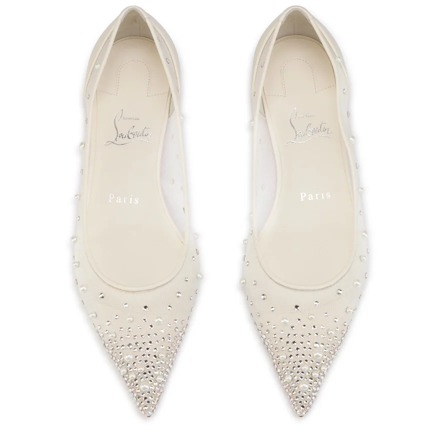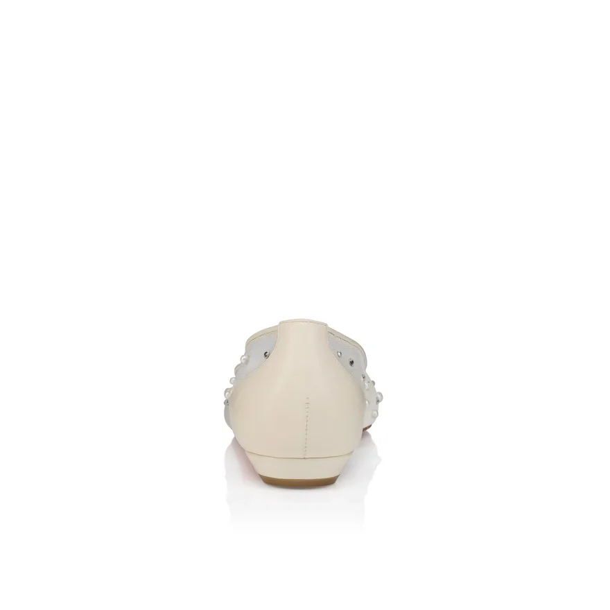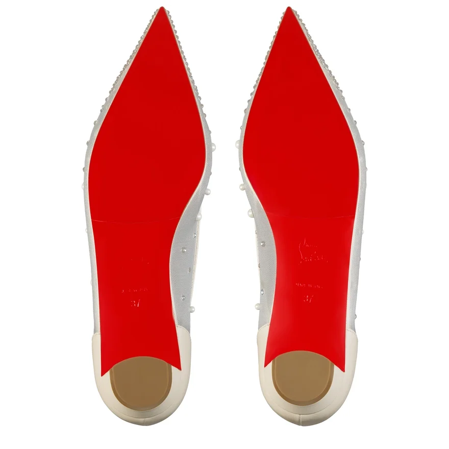 The Tapered Silhouette of the Miss Z Degrastrassina Perla Ballerina Ensures a Sophisticated Style. This Model from Maison Christian Louboutin is Crafted from Bianco White Mesh Outlined with Tonal Lamb Nappa Leather and Features a Padded Insole. The Mesh is Adorned with Hand-Placed Signature Strass and Pearls, Creating a Gradient Pattern Flowing from the Toe to the Heel. This Model Features an ‘Everlasting Red’ Sole Thanks to an Innovative Coating Technique to Ensure Resistance and Lasting Vibrancy for Our Signature Louboutin Red.