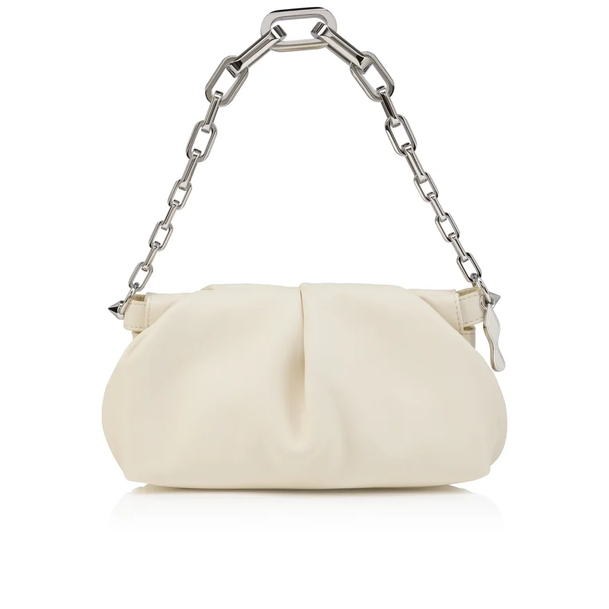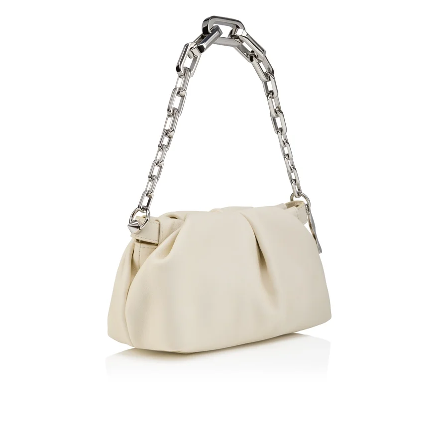 The Eva Shoulder Bag in Size Small Reflects Sophistication with Its Sleek Folds. Crafted from Lamb Nappa Leather in Suzuran White, It Features a Silver Charm Evocative of the Iconic Sole. This Sophisticated Maison Christian Louboutin Bag Can Be Carried by Hand or over the Shoulder Using the Silver Chain.