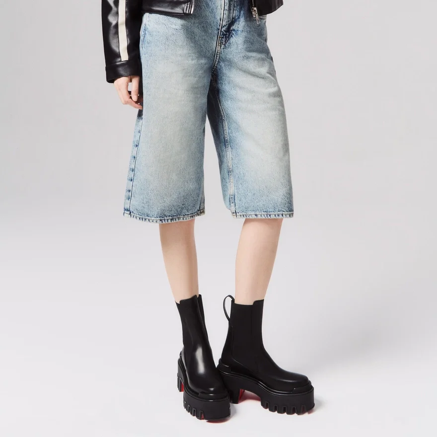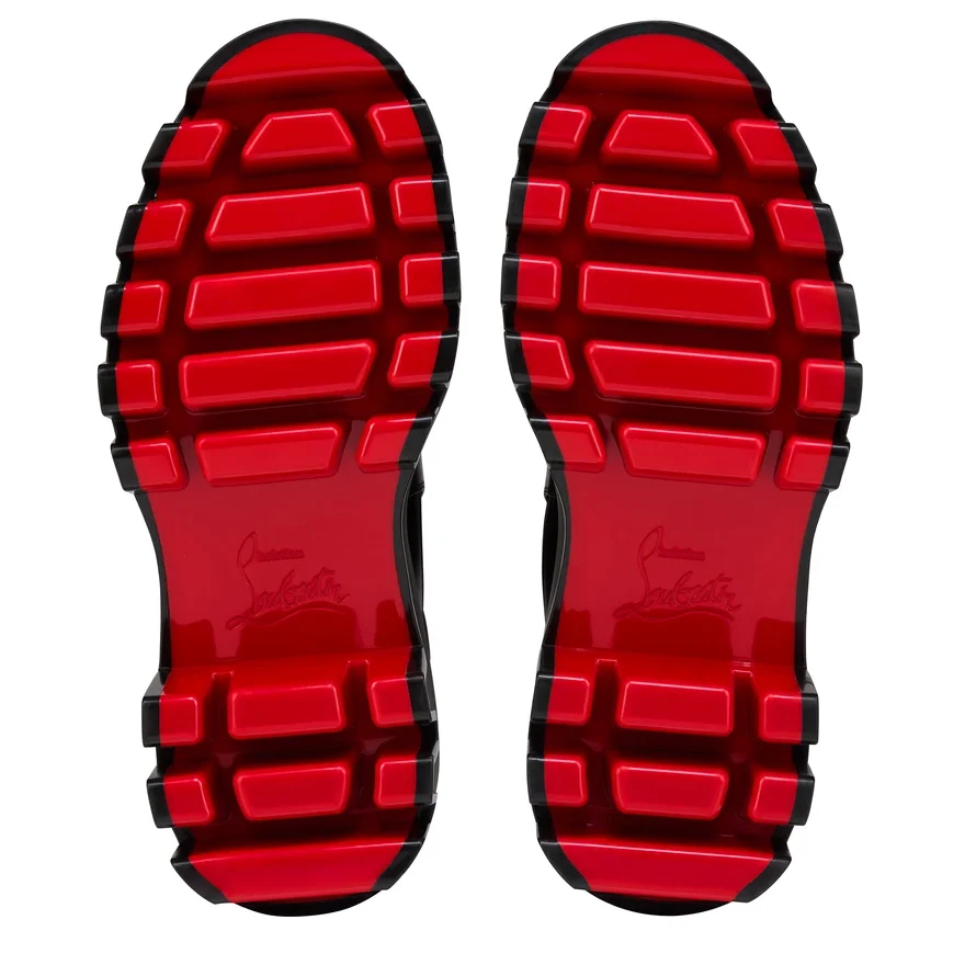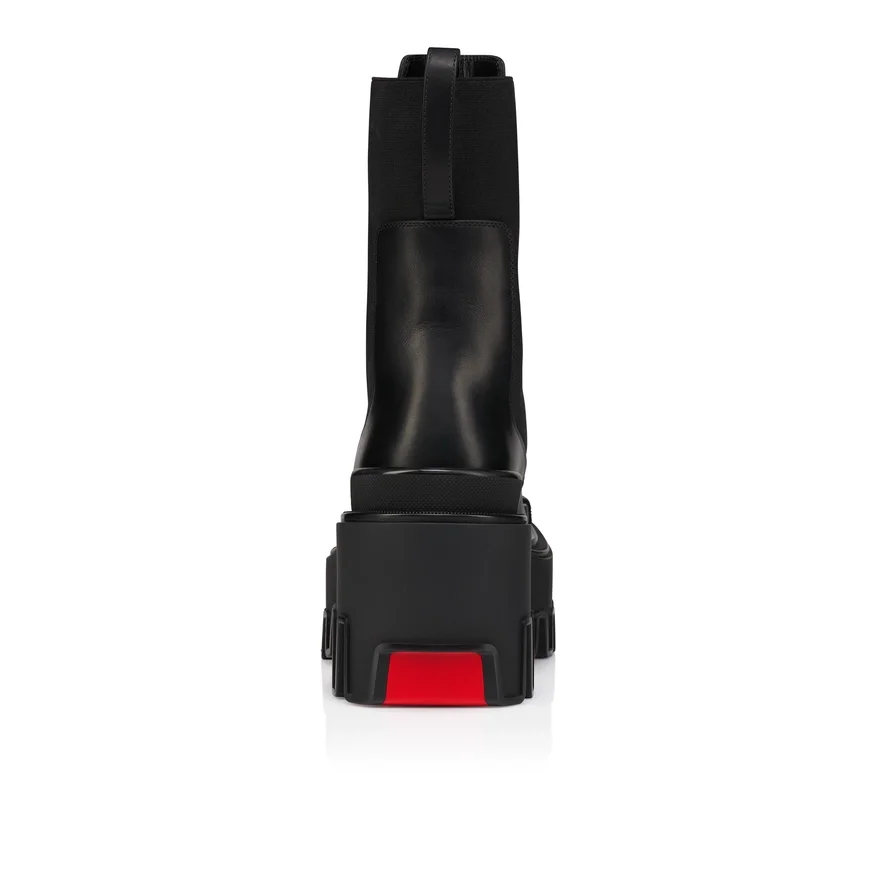 The Marchacroche Dune Maxx Chelsea Boot Enchants with Its Bold Style and Daring, Graphic Lines. This Model is Crafted in Black Waxed Calf Leather for a Shiny Finish. It Features a Curved Toe and Heel Tab with Elasticated Side Panels, Making It Easy to Put on. It Sits on an 80 Mm Tonal Platform Lug Sole with Deep Notches. A Glimpse of the Signature Maison Christian Louboutin Red Sole Can Be Seen from Behind.