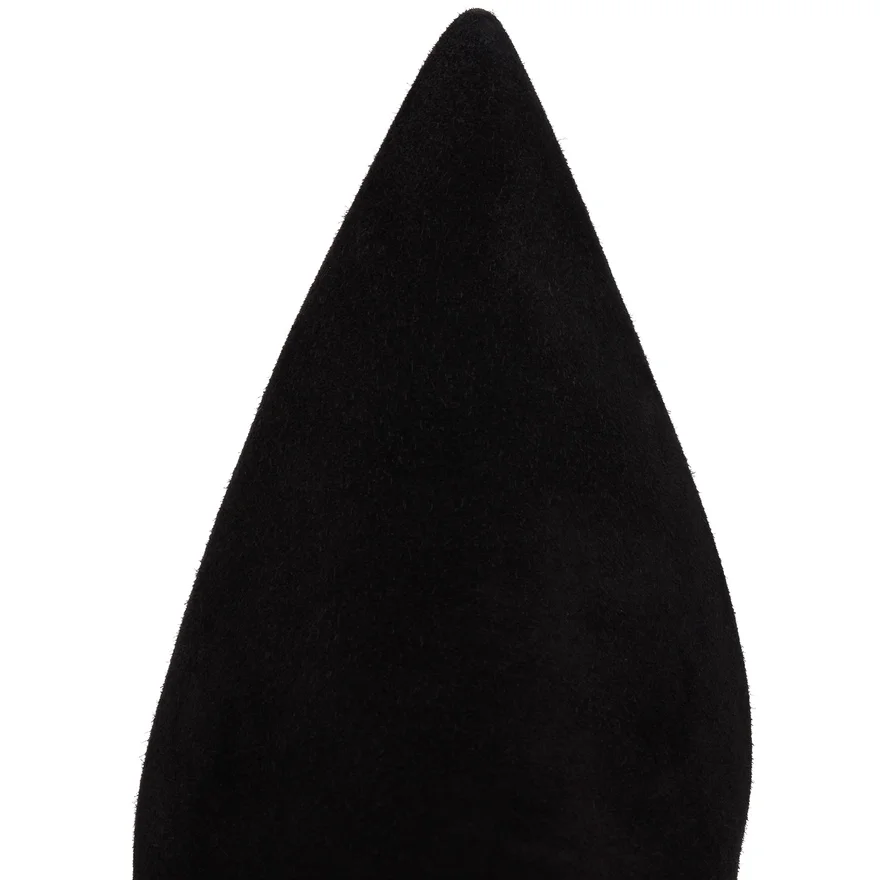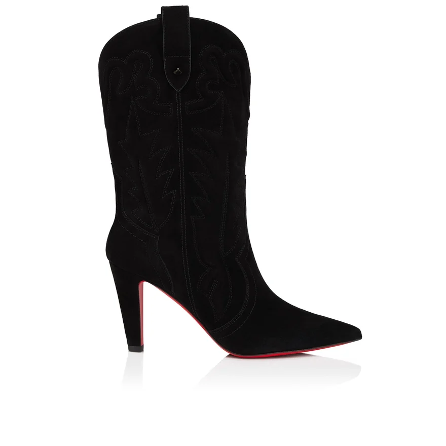 An Expression of Ultimate Sophistication, the Santiabooty in Veau Velours Features an Architectural Pointed Toe, a Metal Embellishment Detail on the Side, and Sits on an 85 Mm Cuban Heel. This Stylish Boot in Black Offers a Contemporary Look, Completed by the Iconic Maison Christian Louboutin Loubi Red Sole.