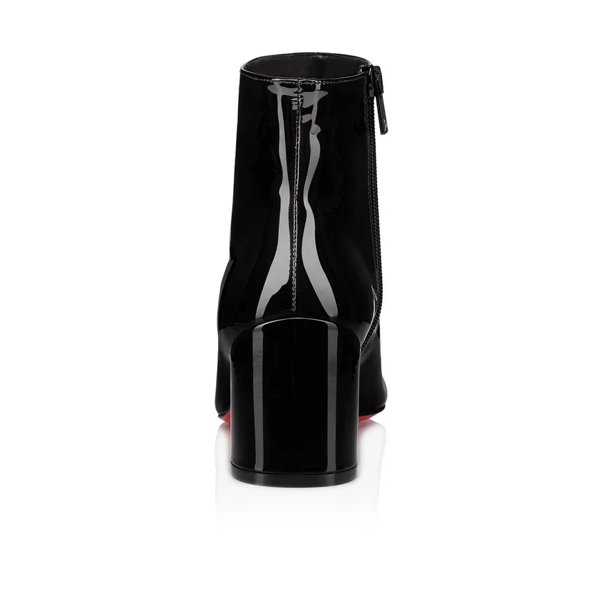 The Elegant and Sophisticated Turela Ankle Boot Features Irresistibly Sleek Lines. This Timeless Shoe is Made from Patent Calfskin Leather and is Set on a Rounded Asymmetrical 55 Mm Heel. The Colourway is Black and It is Fitted with a Side Zip. Tone-On-Tone Topstitching Adds Refined Style to This Maison Christian Louboutin Shoe.