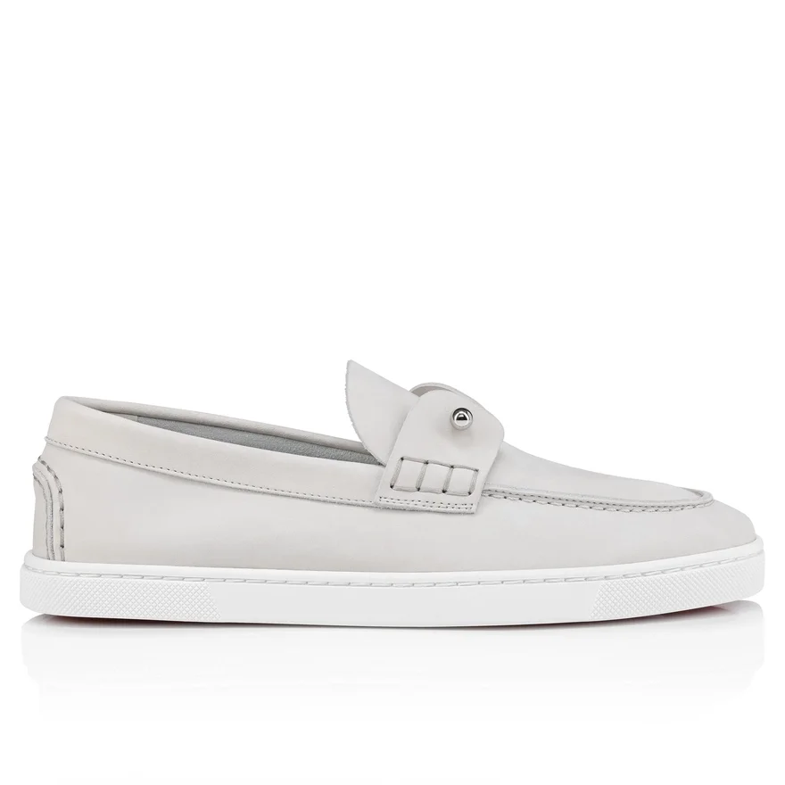 The Chambeliboat Loafer for Women Features a Sleek Silhouette and Supple Structure. This Elegant Model is Entirely Crafted in AlbâTre White Reversed Nubuck Leather. Showcasing Maison Christian Louboutin’s Creativity, It Features a Metal Piercing Through the Tongue. A Summery Model with a White Rubber Sole.