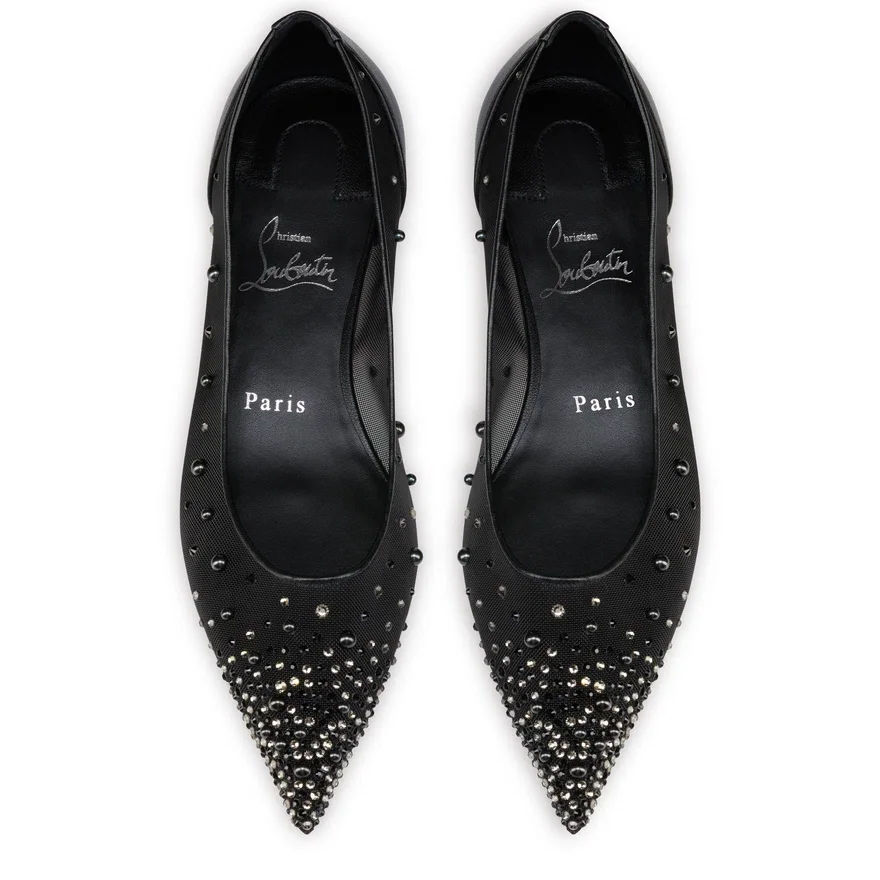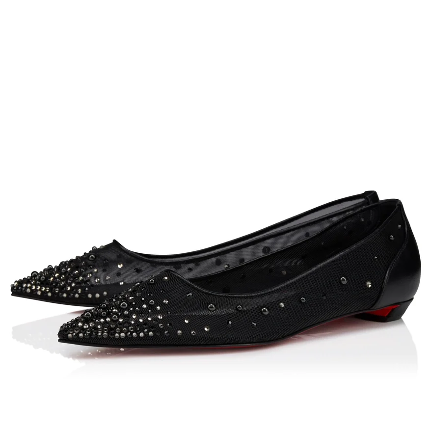 The Tapered Silhouette of the Miss Z Degrastrassina Perla Ballerina Ensures a Sophisticated Style. This Model from Maison Christian Louboutin is Crafted from Black Mesh Outlined with Tonal Lamb Nappa Leather and Features a Padded Insole. The Mesh is Adorned with Hand-Placed Signature Strass and Pearls, Creating a Gradient Pattern Flowing from the Toe to the Heel. This Model Features an ‘Everlasting Red’ Sole Thanks to an Innovative Coating Technique to Ensure Resistance and Lasting Vibrancy for Our Signature Louboutin Red.