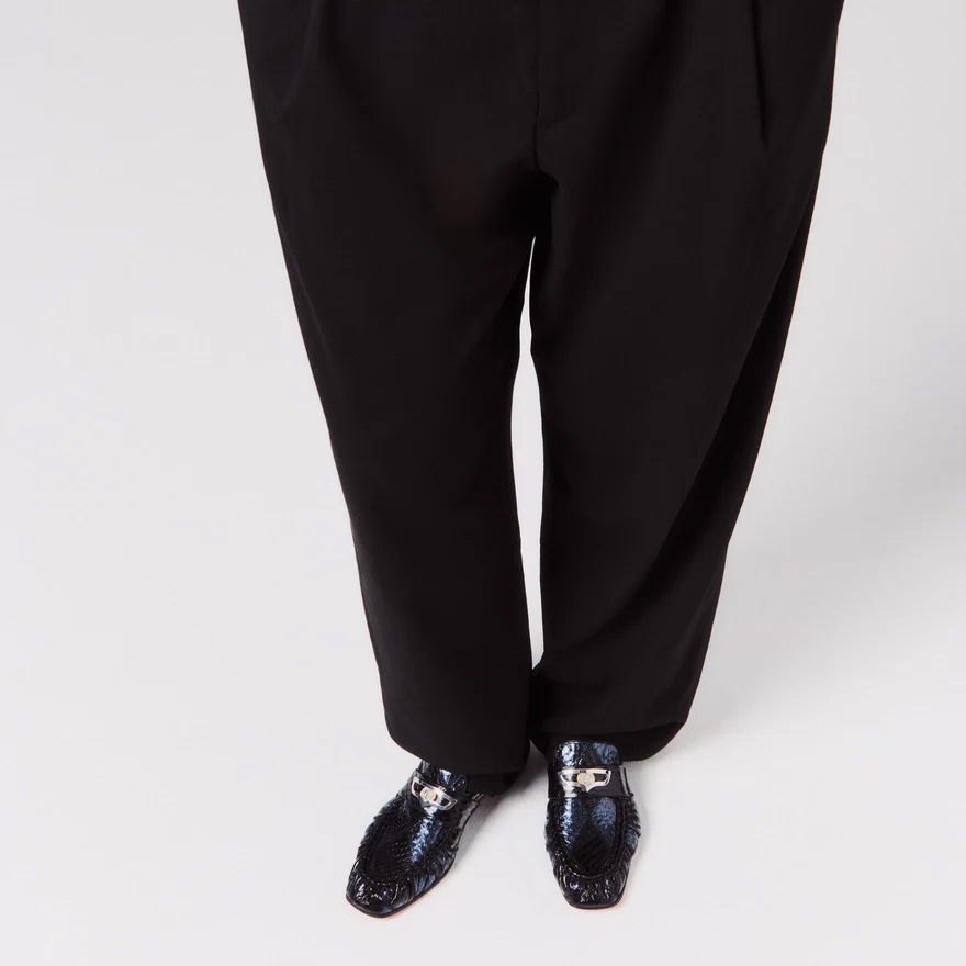 The Mocallista Loafer Has a Refined Design. Crafted in Watersnake Leather with a Black and Last Night Blue Patchwork in a Diamond Pattern, This Maison Christian Louboutin Model Features a Tongue Adorned with a Silver Bar That Holds a Coin Stamped with the Maison Logo, and is Defined by Its Pleated Detailing at the Front.