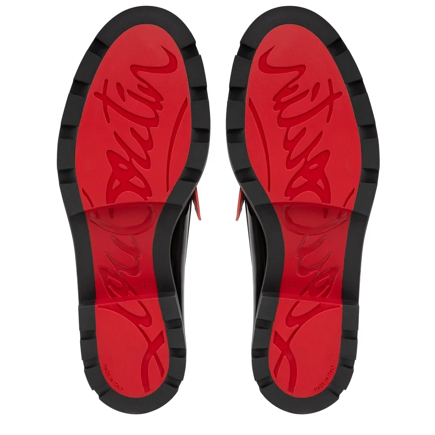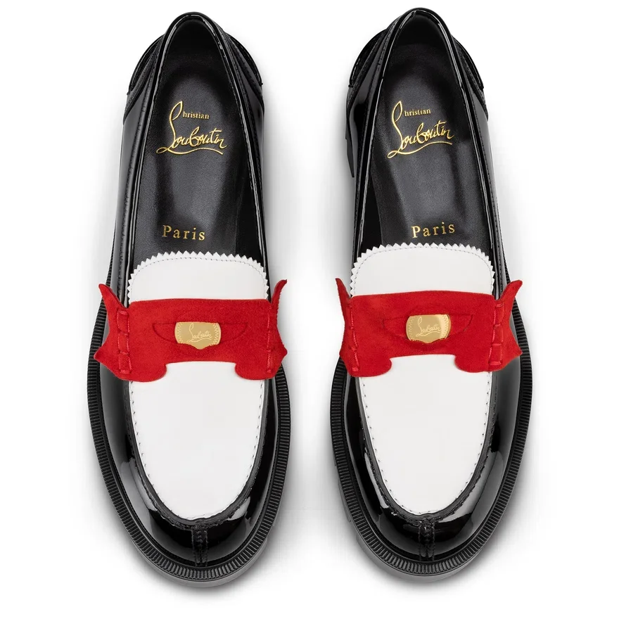 A New Twist on the Penny Loafer, Complete with a Coin Slot, the Penny Lug Enchants with Its Elegant Appeal. This Maison Christian Louboutin Model is Crafted in Black Calf Leather and Red Veau Velours, and Features a Notched Tongue and a 4 Cm Lug Sole.