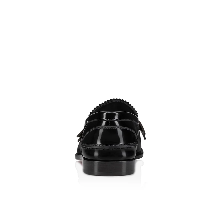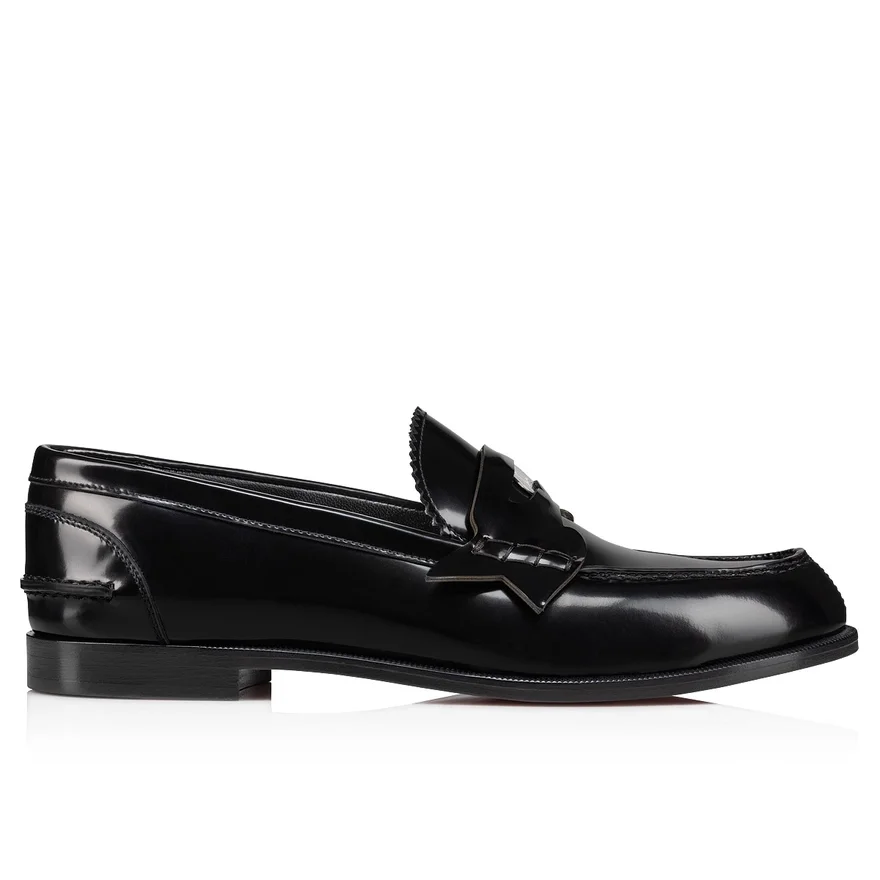 A New Twist on the Penny Loafer, Complete with a Coin Slot, the Penny Enchants with Elegant Appeal. This Maison Christian Louboutin Model is Crafted in Black Calf Leather and Features a Notched Tongue. It is Enhanced with a Strap over the Upper and Outlined with Visible Topstitching for a Graphic Look.