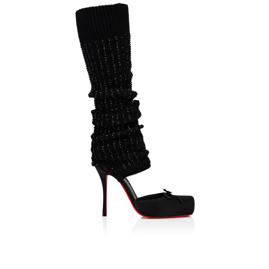 The Strikingly Elegant Cassia Annmac Hybrid Pump Combines the Cassia Look and a Tonal Knitted Legwarmer-Style Sleeve Adorned with Tone-On-Tone Strass. This Maison Christian Louboutin Shoe is Crafted from Black Crepe Satin with Tonal Black Lining, and Set on a 100 Mm Stiletto Heel.