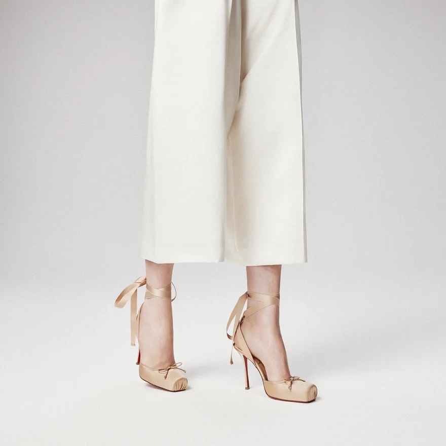 The Strikingly Elegant Cassia Lace up Pump is Inspired by Ballet Shoes. This Maison Christian Louboutin Shoe is Crafted from Nude 1 Crepe Satin and Set on a 100 Mm Stiletto Heel. A Ribbon Ankle Tie and a Small Tone-On-Tone Bow Enhance Its Delicate Lines. This Shoe is Part of the Nudes Capsule Collection.