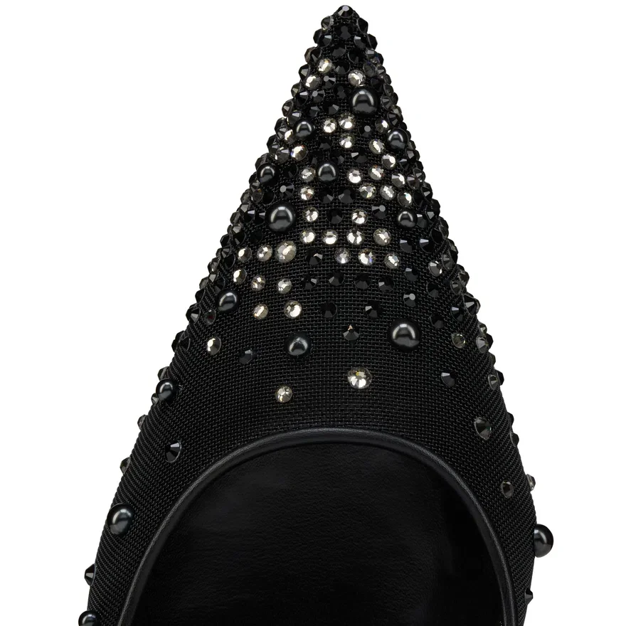 The Tapered Silhouette of the Miss Z Degrastrass Perla Pump Offers Sophistication. Set on a 80 Mm Stiletto Heel That Reveals the Iconic Loubi Red Sole, and Featuring a Padded Insole, This Model from Maison Christian Louboutin is Crafted from Black Mesh Outlined with Tonal Lamb Nappa Leather. The Mesh is Adorned with Hand-Placed Signature Strass and Pearls, Creating a Gradient Pattern Rising from the Toe to the Heel. Revealing the Foot with Its Elegant Vamp, This Model Features an ‘Everlasting Red’ Sole Thanks to an Innovative Coating Technique to Ensure Resistance and Lasting Vibrancy for Our Signature Louboutin Red.