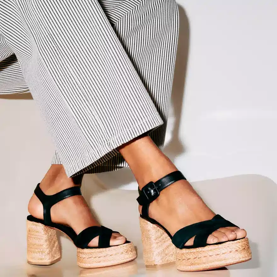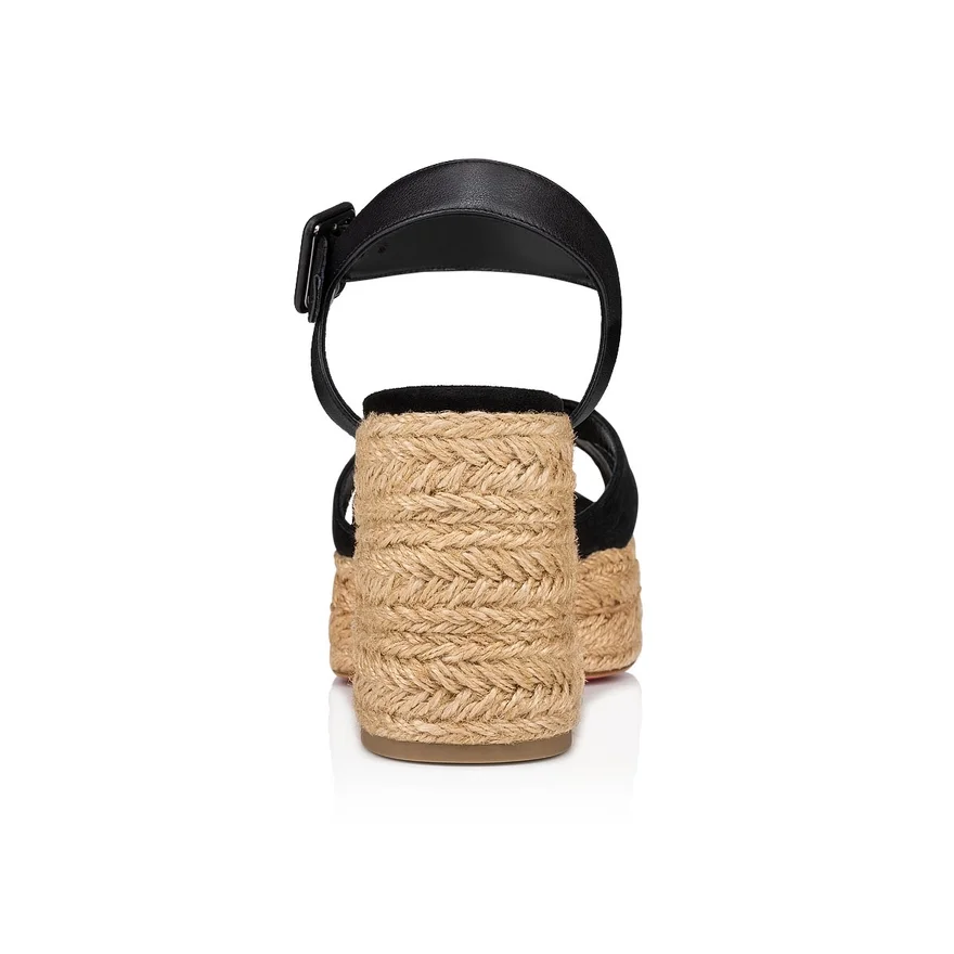 The Calakala Sandal is a New Twist on the Traditional Espadrille with a Braided Sole. This Sophisticated, Architectural Style Showcases Maison Christian Louboutin’s Creativity. The Black Suede Calf Leather Straps Cross over the Upper, While the Ankle is Held in Place by Leather Straps and a Metal Clasp. It Sits on a 85 Mm Heel.