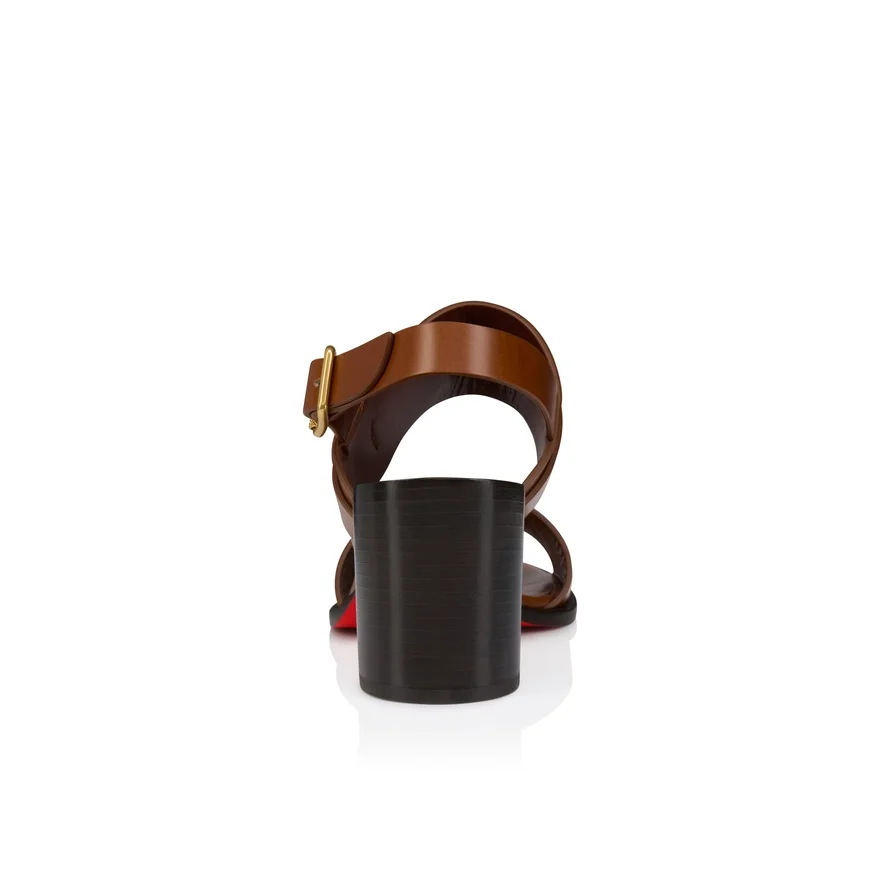 The Versatile Her in Roma Sandal Features a Meticulously Crafted Welt and 70 Mm Block Heel. Defined by Its Wide Straps, Rounded Toe and Adjustable Metal Buckle, This Timeless Design Offers Exceptional Comfort and Fit. The Upper Strap is Adorned with a Metal Maison Christian Louboutin Cl Mooncrest Logo. This Model is Crafted from Dark Carmine Brown Patinated Calf Leather for a Subtle Gradient and Glossy Finish.