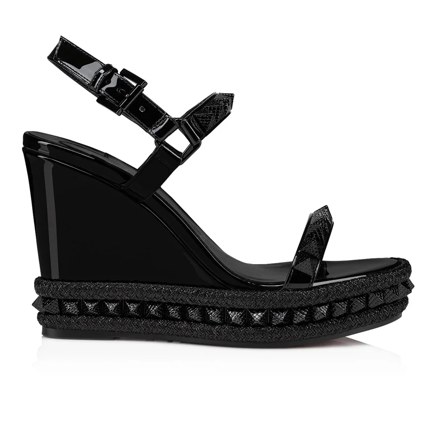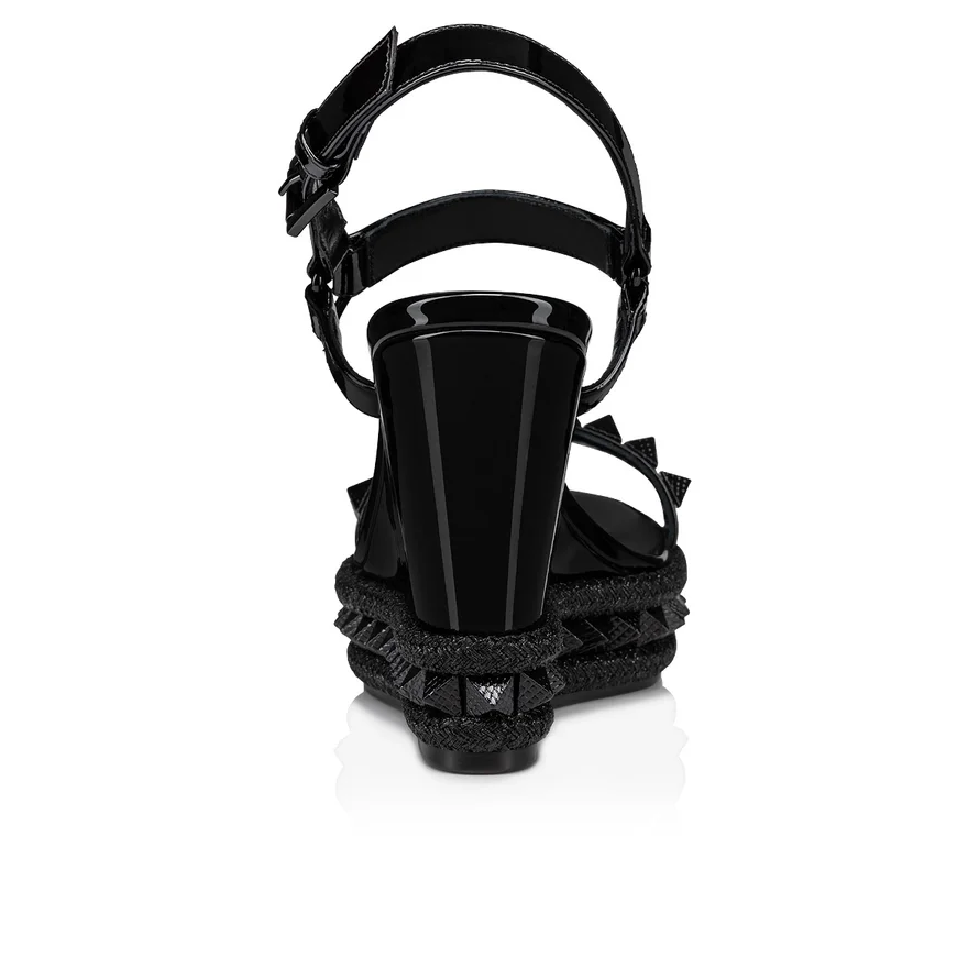 Maison Christian Louboutin’s Pyraclou is a Wedge Sandal That Stands out from the Crowd. It Has Two Slender Straps Adorned with Glossy Pyramid-Shaped Signature Spikes. The Bottom of the 110 Mm Wedge is Also Adorned with a Row of Spikes and These Are Outlined with a Decorative Rope. This Model Showcases Black Patent Calf Leather and is Finished with Tonal Lining.