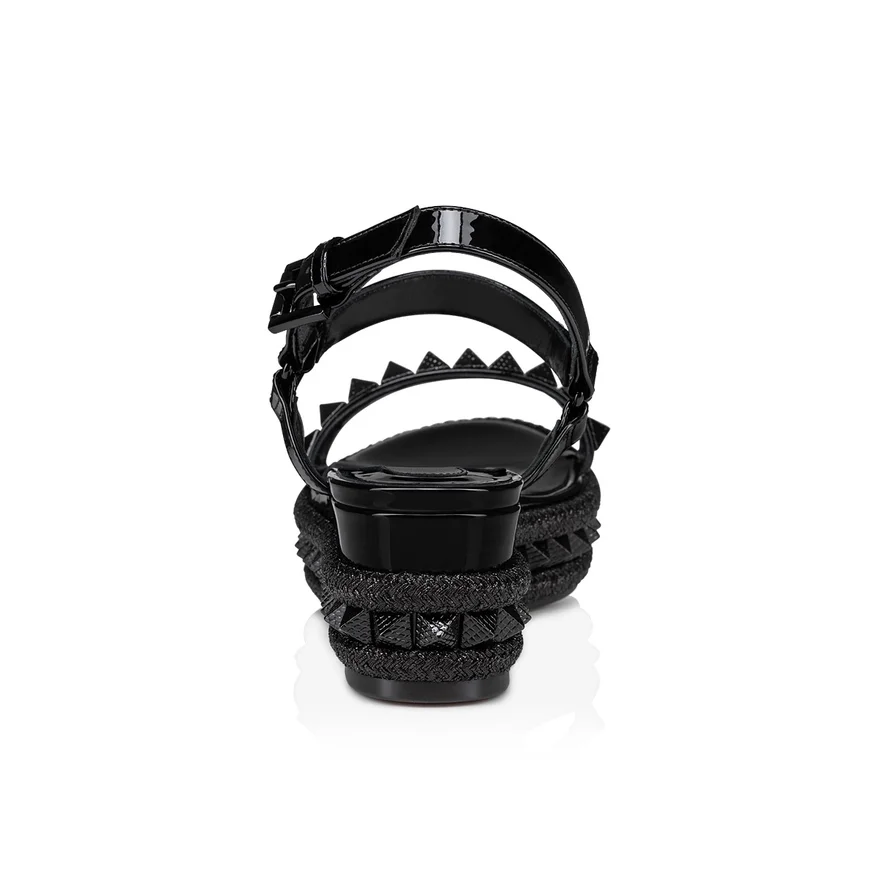 Maison Christian Louboutin’s Pyraclou is a Wedge Sandal That Stands out from the Crowd. It Has Two Slender Straps Adorned with Glossy Pyramid-Shaped Signature Spikes. The Bottom of the 60 Mm Wedge is Also Adorned with a Row of Spikes and These Are Outlined with a Decorative Rope. This Model Showcases Black Patent Calf Leather and is Finished with Tonal Lining.