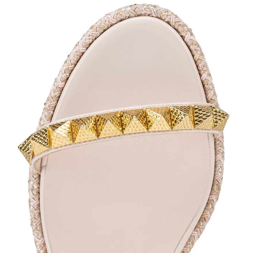 Maison Christian Louboutin’s Pyraclou is a Wedge Sandal That Stands out from the Crowd. It Has Two Slender Straps Adorned with Glossy Pyramid-Shaped Signature Spikes. The Bottom of the 60 Mm Wedge is Also Adorned with a Row of Spikes and These Are Outlined with a Decorative Rope. This Model Showcases Patent Leather in Leche Beige with Gold Spikes.
