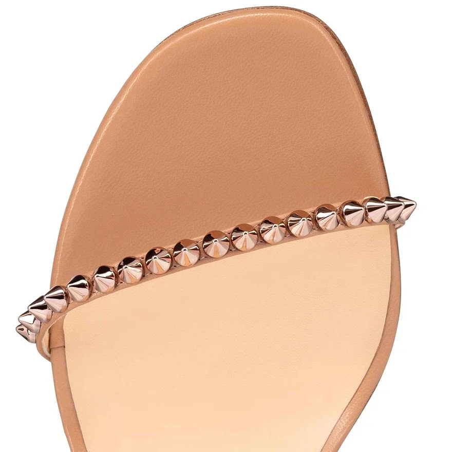 A 100 Mm Heel That Lengthens the Silhouette Merges with Christian Louboutin’s Beige Blush Leather So Me Shoe. The Open-Toe Sandal Features Straps Adorned with a Single Row of Rose Toned Emblematic Spikes. An Ankle Strap, Reminiscent of a Choker Necklace, Adjusts with a Buckle for Added Audacity.