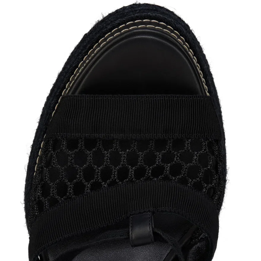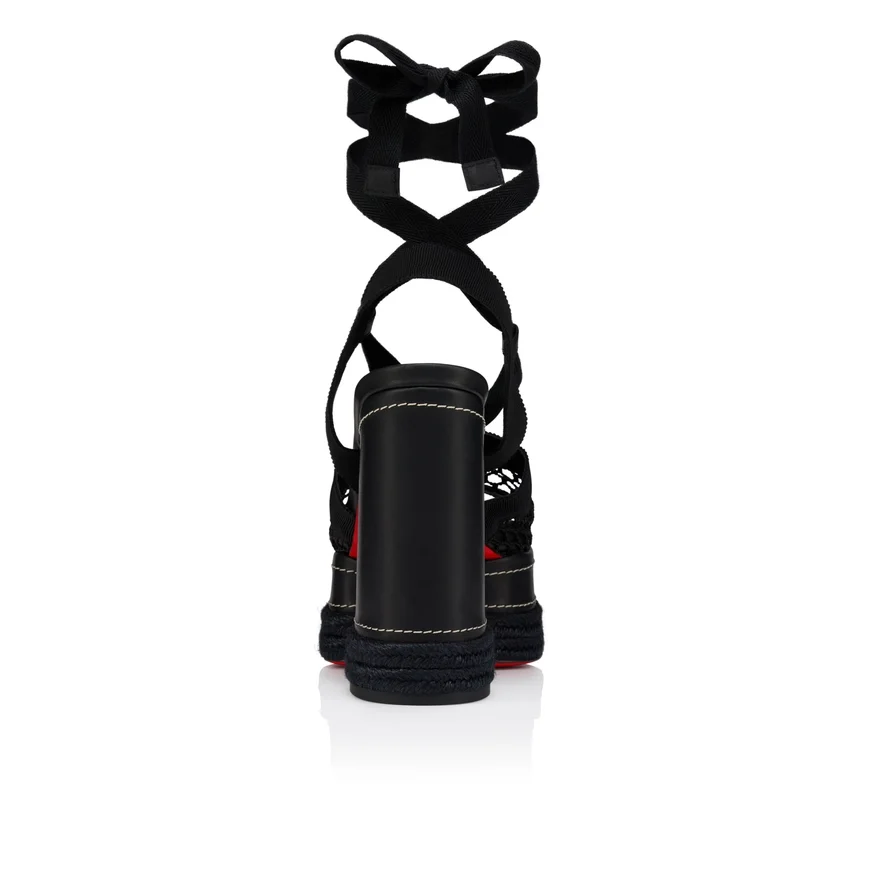 Maison Christian Louboutin’s Toledissima Sandal Sits on a 45 Mm, Lightweight Platform Sole and a 130 Mm Block Heel. The Intricate Rope Detailing Around the Sole and the Elegant, Knitted Upper Are Reminiscent of Summer Espadrilles. It is Crafted in Black with a Combination of Saddle-Stitched, Waxed Calf Leather and Mesh. This Open-Toe Design is Finished with a Ribbon Strap, Defining the Toe and Gently Encircling the Ankle.