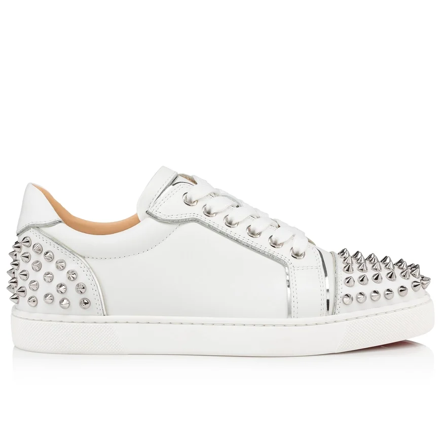 The Vieira 2 Low-Top Sneaker Stands out for Its Nude Calfskin Lined Interior, and Sits on a White Rubber Sole. Its White Calfskin Upper Highlighted by Silver Laminated Calf Leather Finishes is Enhanced by Metallic Signature Spikes. This Dynamic and Sophisticated Minimalist Shoe Features the Elegant Lines So Characteristic of Maison Christian Louboutin.
